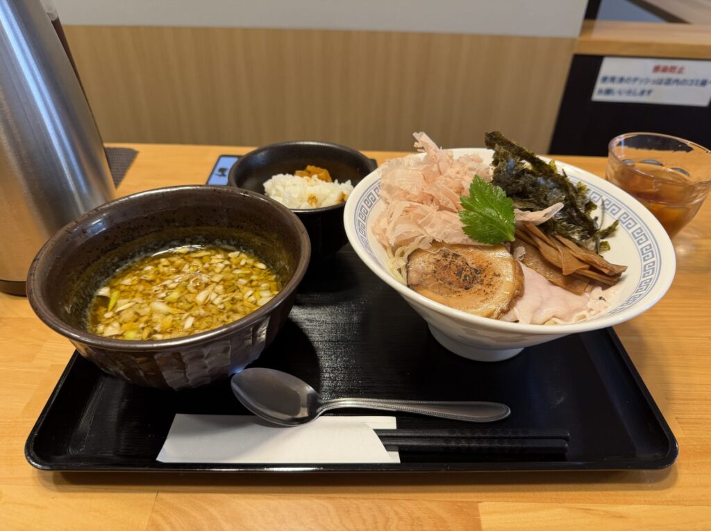 スープは、(多分)鶏がふわっと香るシンプルかつあっさり目のシャバシャバ系です。麺を引っ張り出すと、麺が少しくっつきやすい感じで、鰹やのりが漏れなくついてきます。ちょっと食べにくくもあり。つけ汁にくぐらせるとスープをしっかり持ち上げるので、シャバシャバ系とはいえ、結構濃い目に感じます。スープはシンプルも、具材が豊富なため、最後まで変化を楽しめます。ただ、最後の方は鰹味が支配してくるような。割りスープも鰹出汁でしたし。