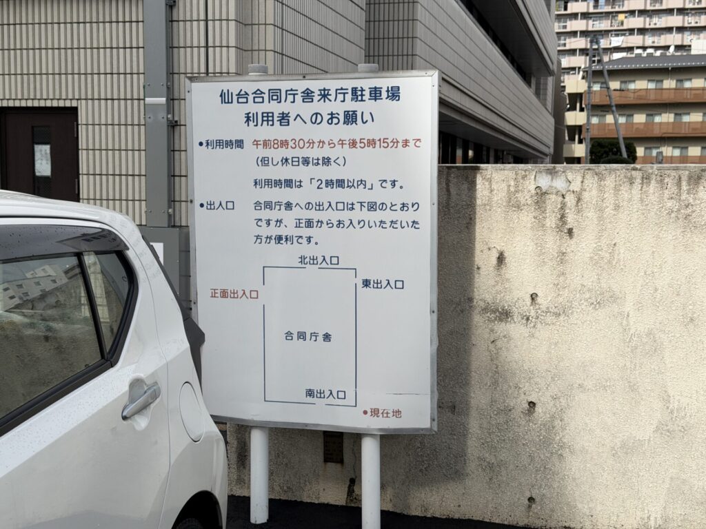駐車場はないものの、土日祝に限っては、隣の仙台合同庁舎の駐車場が、午前9時から午後6時まで解放されていて無料で利用可能です。29年前から変わっておらず、当時よく利用してました。