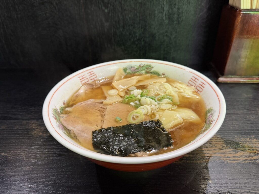 トッピングは、メンマ・のり・ネギに、チャーシュー2枚とワンタン3個。チャーシューは歯ごたえある肉肉しさを残すもので、ワンタンは餡も多い肉厚なタイプ。