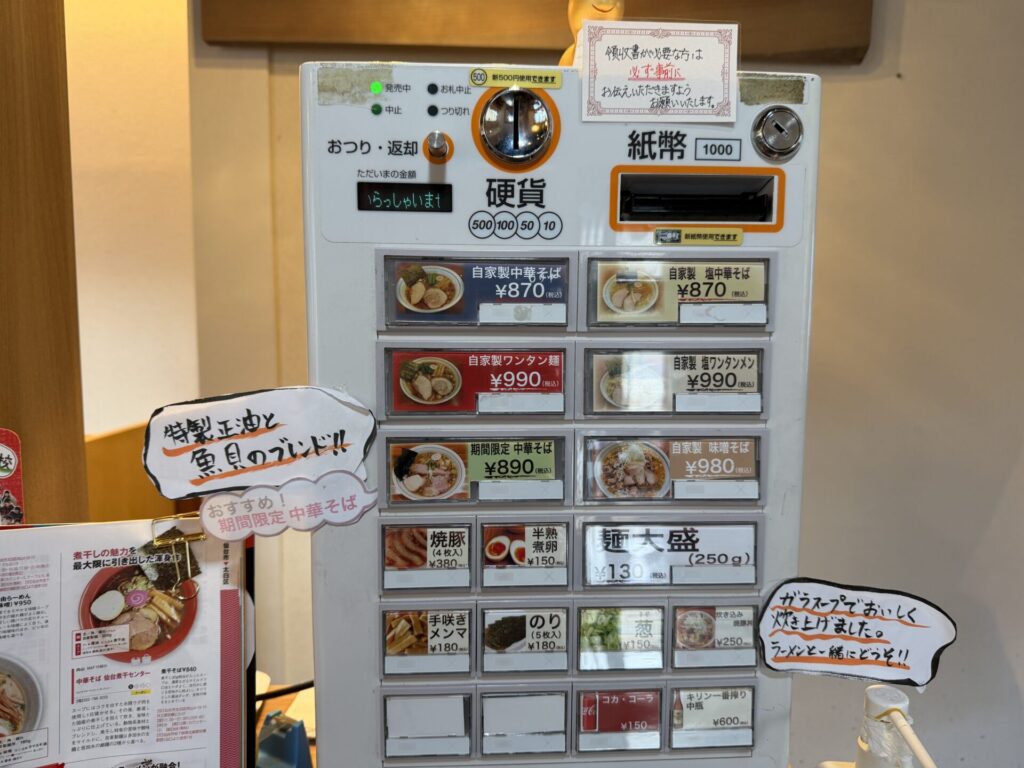 最初の入口を入ると待ち椅子がある小部屋で、もう一つ扉を開けると正面に券売機。2年ぶりなのに数十円とかなり小幅な値上げに留まっていて少々驚きました。本日は、自家製濃厚魚介つけ麺普通1,100円と炊き込み焼豚丼250円をいただきます。券売機の表記は、自家製つけめんですが、公式Xでの案内の表記に従います。特盛まで選択可能なのはなにげにすごいも、少食なので量により値段は変えて欲しいところ。