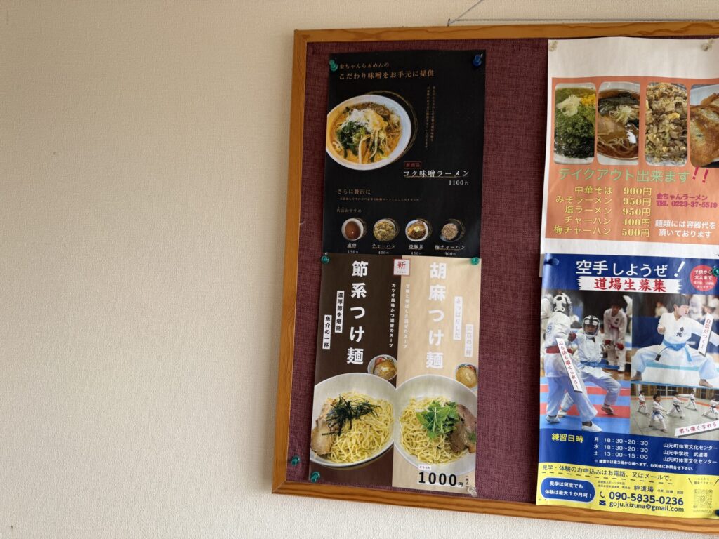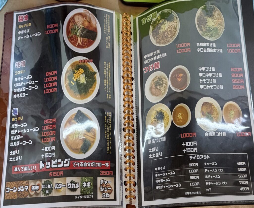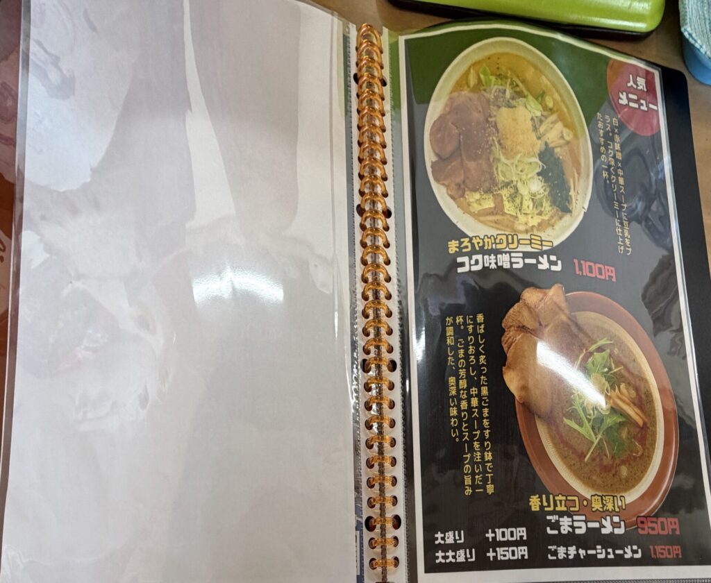 券売機はなく、席で注文後払いです。醤油味噌塩、まぜそば、つけ麺と幅広くラインナップ。本日は、ごまラーメン950円をいただきます。
