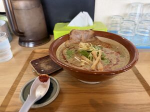 卓上にはラー油や一味などの味変アイテムはなく、割りスープのみしばらくしたら提供されました。