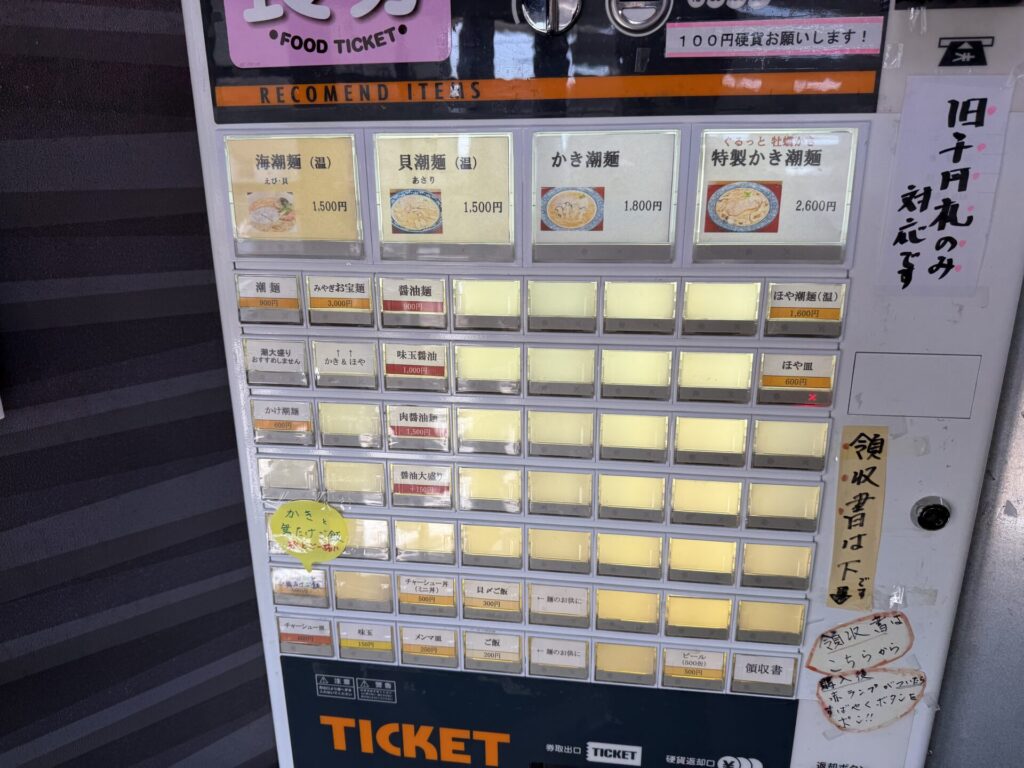 撮影禁止の張り紙がなくなっていたので、券売機を撮影させていただきました。残り3営業日のためか、カレーや辛い系、味噌などはなく、メニューは絞られています。悩んだ末、ここでの最後は、醤油麺900円と外でも案内されていた限定のかきと舞たけご飯600円にします。最後まで旧札のみで新札使用不可のままで、今回も交換してもらいました。