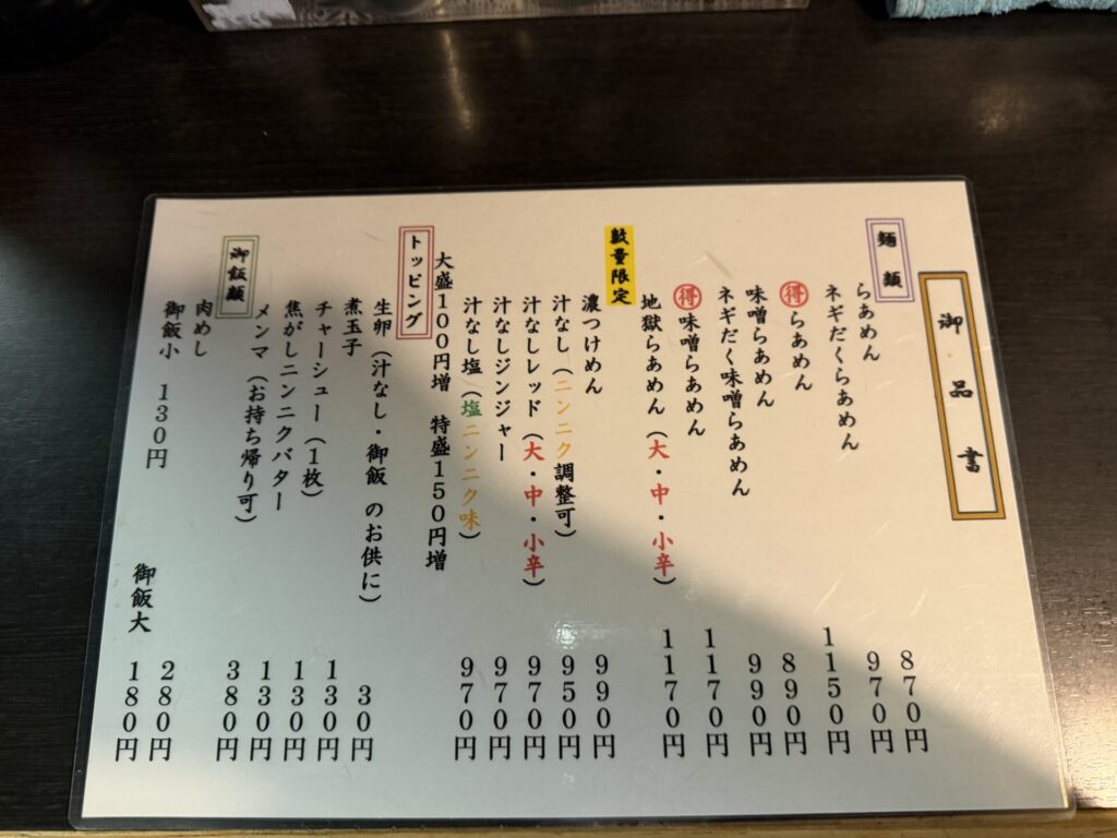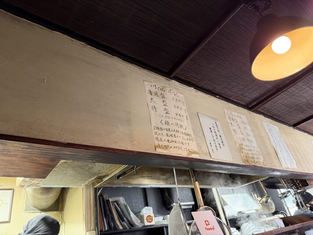 店内にもメニュー表あり、頭上には、普通盛りでつけ麺230g、らぁめん180gと麺量の案内がありました。