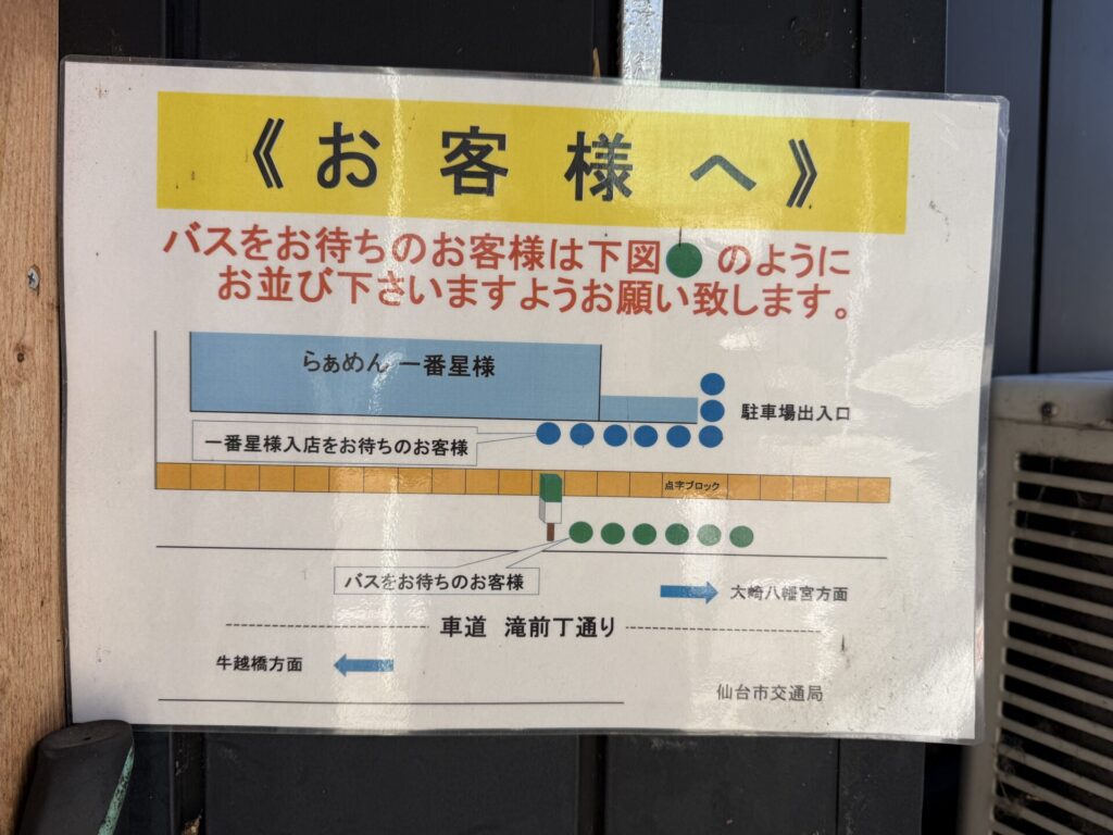 バス停裏という珍しい立地ゆえ、仙台交通局作成の並び案内あり。本日は休日、開店前15分ぐらいで待ち2組。開店直前になると来客が続き、開店即満席、外待ち発生の状況でした。