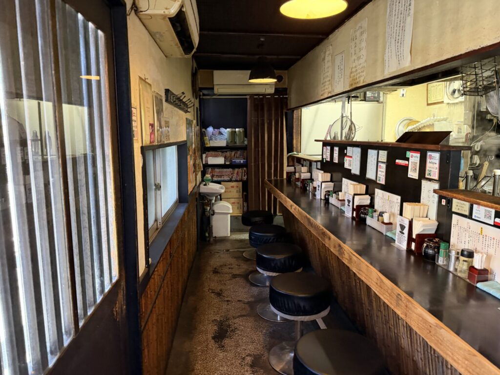 店内は、厨房前に一列のカウンター8席のみで狭め。お冷はセルフサービスで入って左奥にあります。照明が暗めで、2009年オープンともう16年も営業されているので結構年季が入って渋めの雰囲気です。
