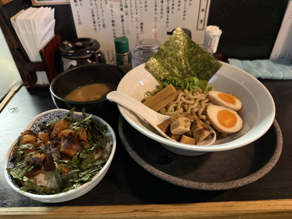 サイドの肉めしはチャーシューも、のりもたっぷりでお得感あり。肉感は薄く若干塩っぱめも結構な量のご飯とは相性はよかったです。少しだけ残ったつけ汁と一緒にいただくも、こちらは普通でした。
