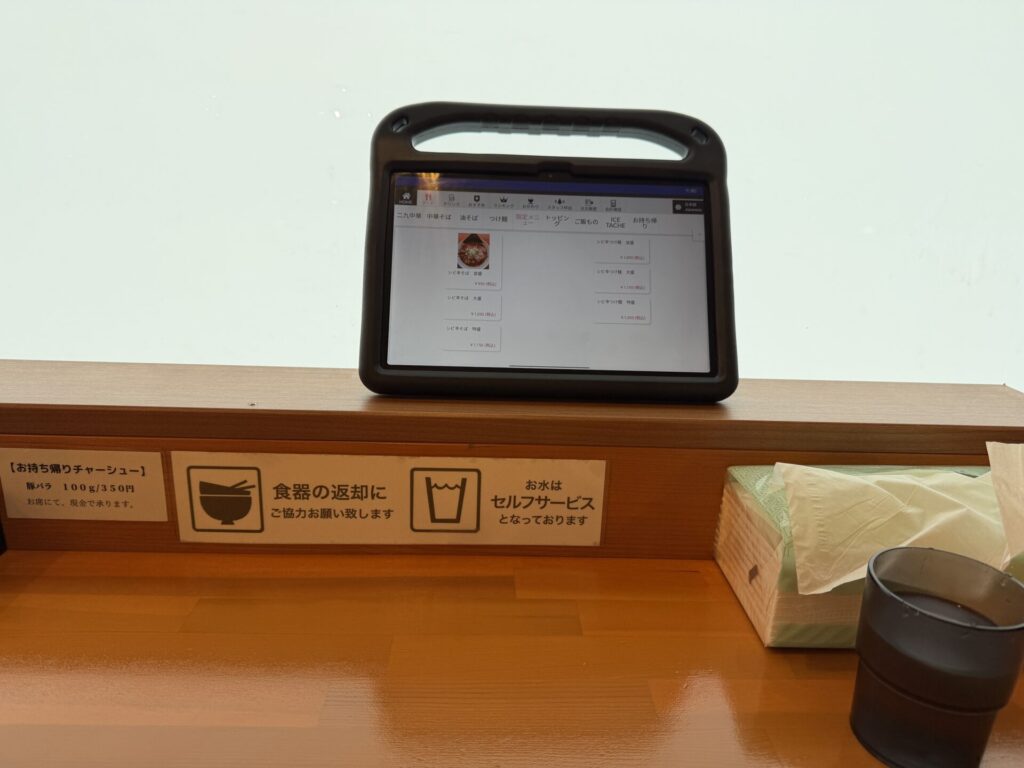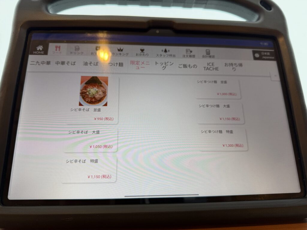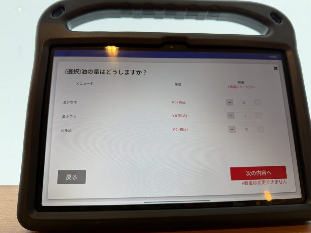 席のタブレットの様子です。初めても特に操作に迷うような箇所はなかったです。特徴的なのは、最初から家系のように麺の硬さ・油の量・味の濃さがそれぞれ指定できるところです。限定メニューですら選択画面がありました。