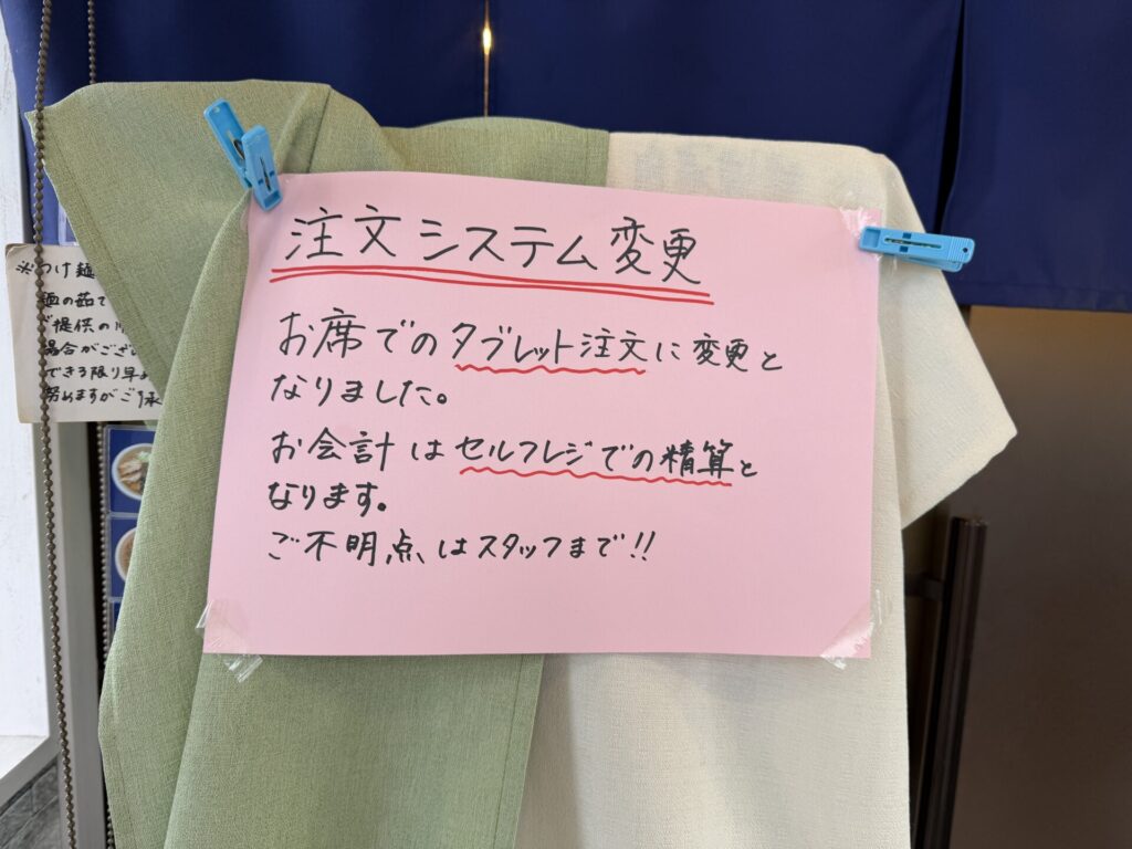 平日開店前は待ち2組。後客は3組ぐらいでした。前回訪問からメニューは価格ともに変更なしも券売機のあった場所にシステム変更の張り紙があり。メニューの下に設置のウエイティングボードは変更無し。空席ありのときはそのまま案内可と張り紙されているのでとてもわかりやすいです。