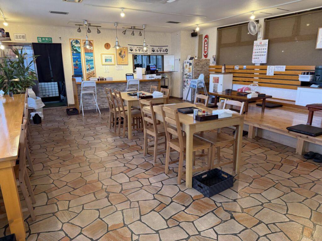 店内の様子です。2022年10月オープンとまだ新しく、本店は、山形の赤倉温泉スキー場にあるそうです。店内は整理整頓され、清潔な印象です。座敷とテーブルが2卓ずつ壁際にカウンターが7席ぐらい設置されています。水と食器の返却はセルフサービスで、事前に案内あり。つけ麺の割りスープもセルフでポットの案内がありました。接客はスムーズで気持ちいいです。