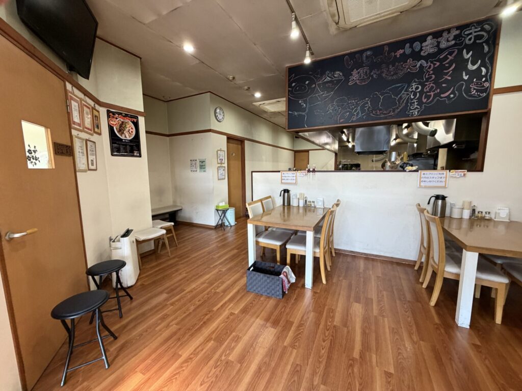 店内レイアウトは、入って正面4人テーブル2卓、左側待ち席、右側に券売機、奥1列に6席ほどのカウンターです。