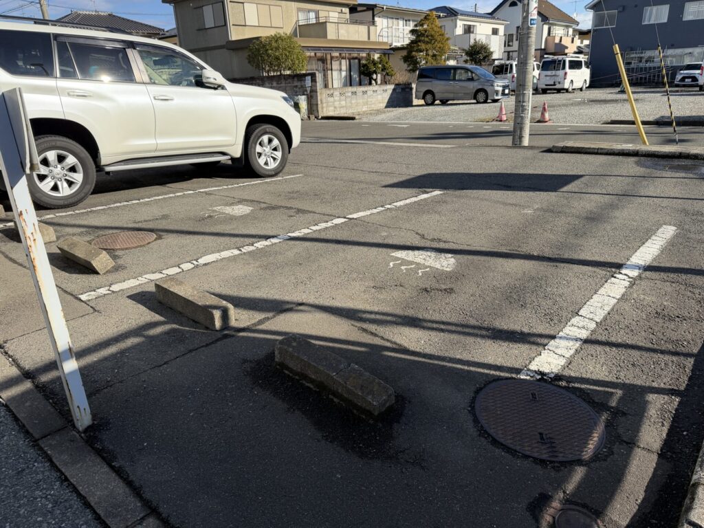 店舗前の駐車スペースの様子です。公道に面して狭いので車なら第二駐車場がおすすめ。