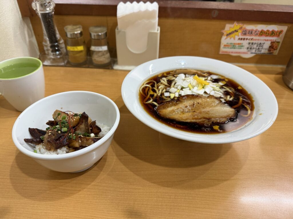 麺量並ゆえ、見た目が寂しい感じですが、量的には十分です。またご飯も減らしてもらったのでサイドメニューもさらに寂し目もこちらもブログ主には十分です。