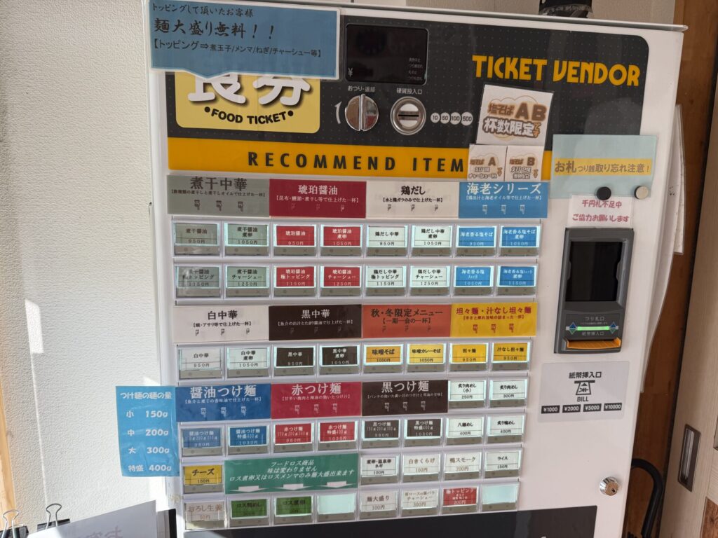券売機制で、入口すぐ左に設置されています。トッピングすると麺大盛り(100円)無料ゆえ、よく食べられる方はトッピングがお得です。