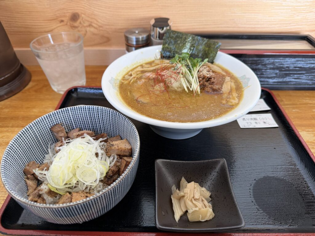 2年ぶりゆえ、流石に値上がりしていましたが、50円ほどと小幅にみえます。本日は、味噌カレーそば1,050円と炙り肉飯(小)200円をいただきます。ラーメンは細麺と太麺選択で、細麺を選択し、肉飯は、マヨネーズの有無選択で、今回は無しにしてみました。