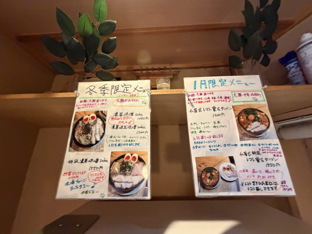 本日は、お目当てだった1月限定メニューの仁屋式トマト蒙古タンメン1,200円をいただきます。小辛~激辛まで辛さが、太麺と細麺が選べ、さらにニンニクまし、トマト抜きなども可能。今回は、大辛・細麺でいただくことにしました。