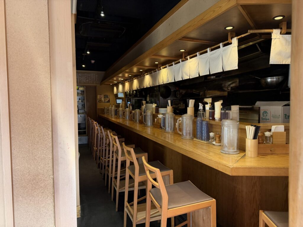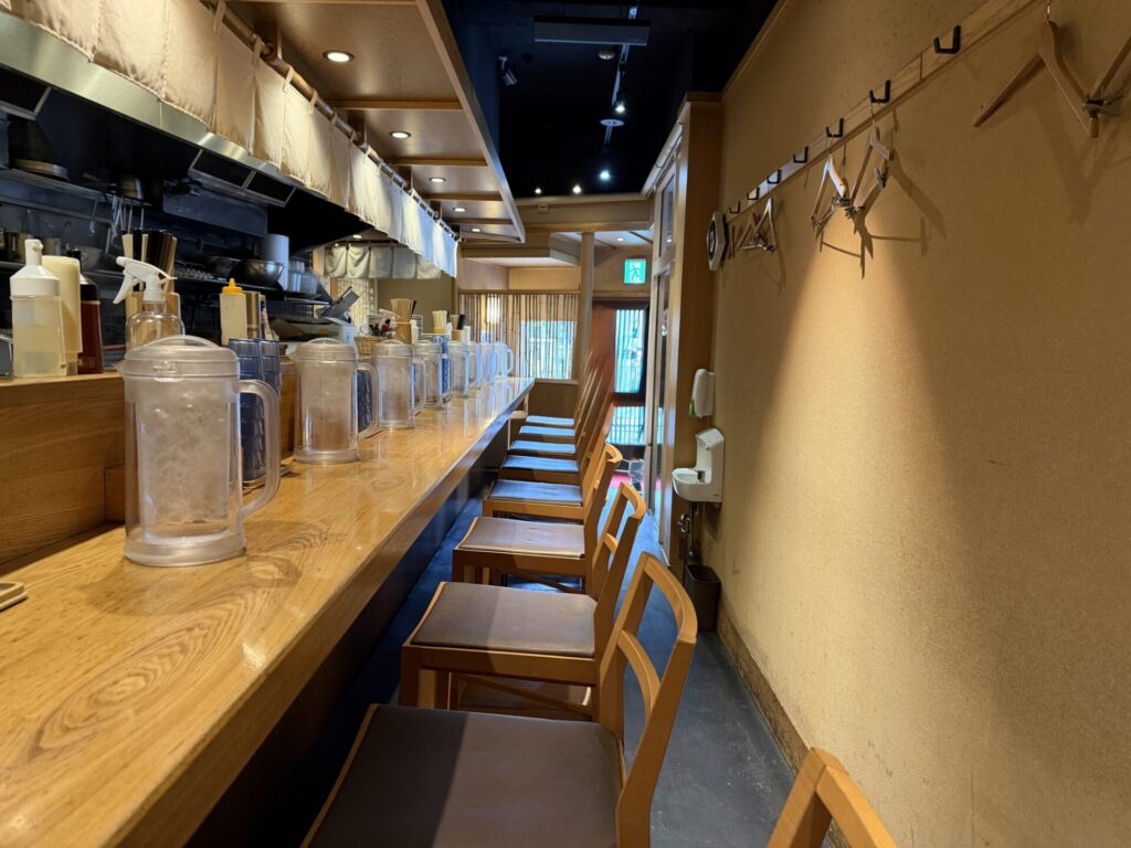 店内はL字のカウンター十数席のみで座席の後ろは狭め。おぼろげな記憶だと、左側に厨房で逆向きに座っていたイメージでしたが記憶違いか、本当に当てにならいない・・・・・・・・・・。