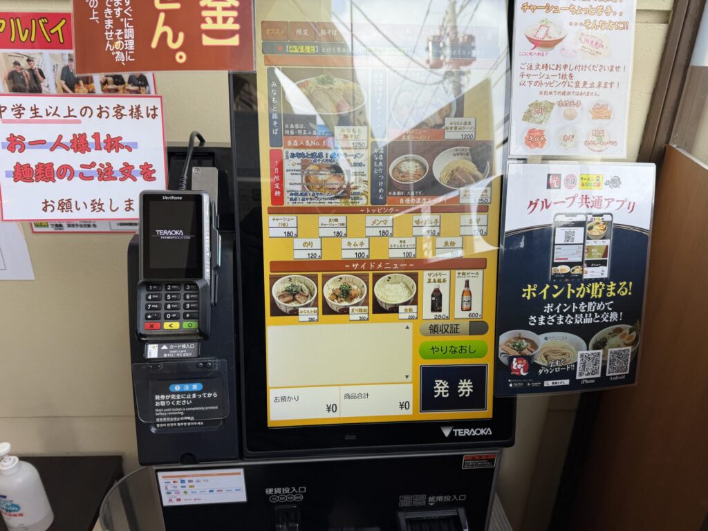 入口入って右側にキャッシュレス完全対応のタッチパネル式券売機があり、満席で並ぶ場合は先に食券購入の案内あり。券売機は何度か遷移と確認があるも初見でも操作にまどうことはなくわかりやすいです。