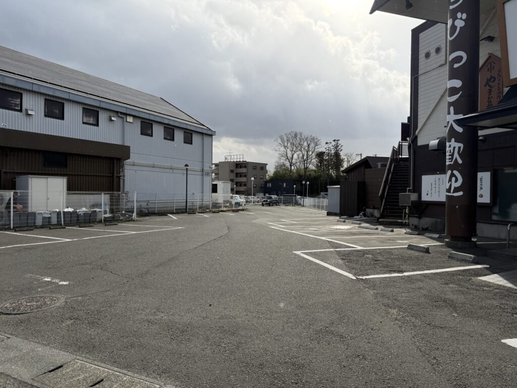 286号沿いの立地で、店舗周囲はすべて数十台規模の広大な共同駐車場ゆえ、駐車場で困ることはなさそう。地下鉄富沢駅から歩いても30分ほどです。