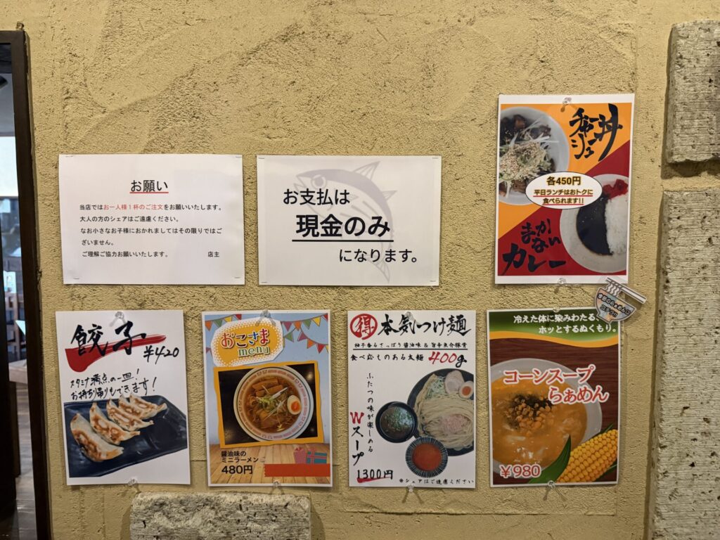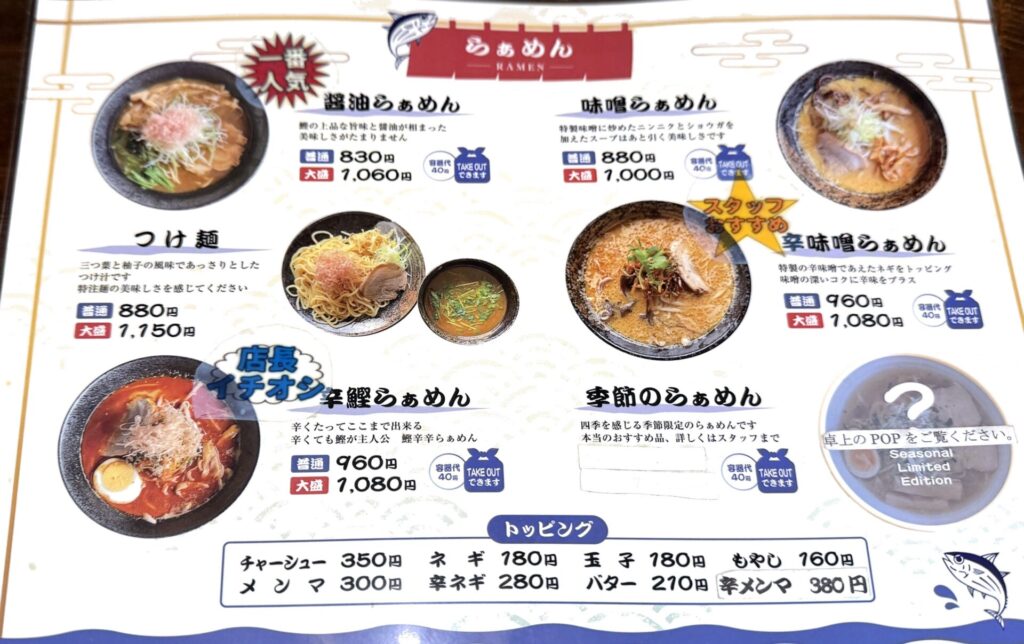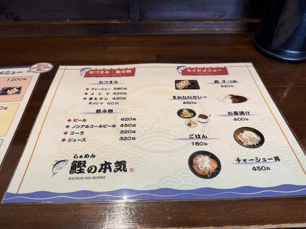 メニューは、以前のメニューベースに平日ランチタイムはセットでお得にいただけるサイドのカレーやチャーシュー丼やコーンスープなる変わり種メニューが追加されていました。麺量も2段階に。本日は、以前はなかったと思われる辛鰹らぁめん960円をいただきます。