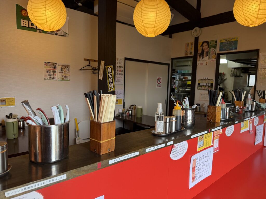 店内は、対面カウンター9席?ぐらいと4人テーブル2卓のレイアウト。平日限定でタマネギみじん切りセルフサービス中。訪問時気づかなかったのですが、あたたかい黒烏龍茶もセルフサービス中でした。お冷もセルフで入口脇に設置されていますが、窓際やテーブルにもピッチャーが設置されていました。さらに、セルフサービスは配膳時に積極的に案内もされていて、お客さん本位をそこかしこに感じさせられました。
