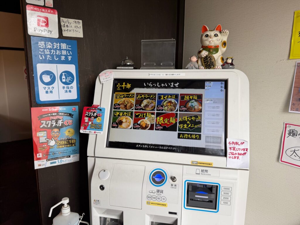 タッチパネル式券売機制で、入口入ってすぐ右手に設置。店員さんにお声掛けすればPayPayなどのバーコード決済も可能でした。券売機にて各種マシすべて選択可能でありがたいシステム。操作も迷うことなくわかりやすいです。比較的近いためか、基本メニューの他、名取店は塩、本店は味噌・担々とそれぞれでしかいただけないメニュー設定あり本日は、本店でしかいただけない担々麺目的に訪問。