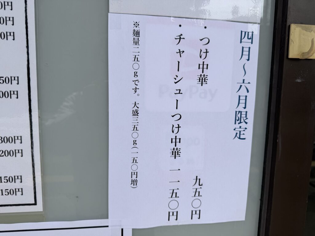 レギュラーメニューには、味噌と辛味噌のオプションが追加されている以外は価格含めて変更なしのよう。本日は、つけ中華950円としょうが肉ごはんミニ200円をいただきます。席で注文、伝票で後払いpaypay利用可は変更なし。