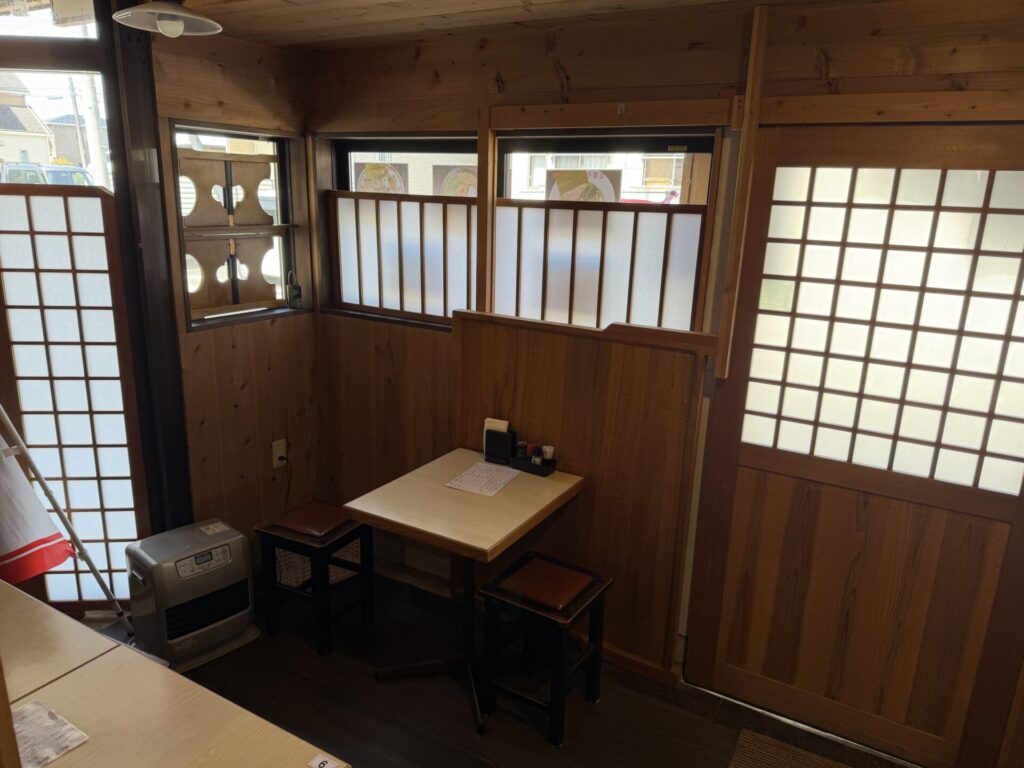 店内は入口入ったところに小スペースとテーブル席、正面1段上がった位置に7卓ぐらいのテーブル席があります。ここは2018年ことり舟さんの頃訪問したことがありますが、当時はすべて座敷で靴を脱いでいたような気もします。現在はリフォームされたのか、靴は脱ぐ必要なく座敷はなくなってました。テーブルにピッチャーありますが、中央にお酢やフライドガーリック・麦茶などセルフでいただけるようになってました。